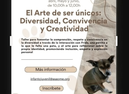 A través de este taller de dos horas, en el que los participantes (escolares de primaria) trabajarán el concepto de diversidad y convivencia guiado por un perro con discapacidad especialista en intervención en salud mental, a la vez que trabajan su propia diversidad a través de la realización de su autorretrato con diversos materiales y técnicas plásticas.